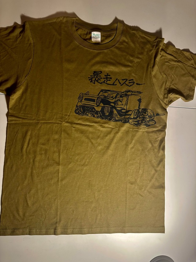 ・ブラスティン暴走ハスラー半袖Tシャツ(Stevenデザイン) 素材:綿100% フロントプリント サイズ:S,M,L,XL,2XL 色:カーキグリーンxブラックインク だいたいの平置き採寸(参考) S=肩幅:41cm 身幅:48cm 着丈:65cm M=肩幅:43cm 身幅:51cm 着丈68cm L=肩幅:45cm 身幅:54cm 着丈:71cm XL=肩幅:47cm 身幅:57cm 着丈:74cm 2XL=肩幅:50cm 身幅:60cm 着丈:77cm ※在庫有は2~3日以内に発送。 ※受注プリント購入は10日以内に発送予定。 ★セルフシルクスクリーンプリントのラフ刷りとブリーチアート ※ハンドメイド作品のため同じものはありません。 ブリーチアートも若干変更あり ※在庫を他サイト、ライブ会場と共有しているため、タイミングにより売り切れになる場合がありますのでご了承ください。